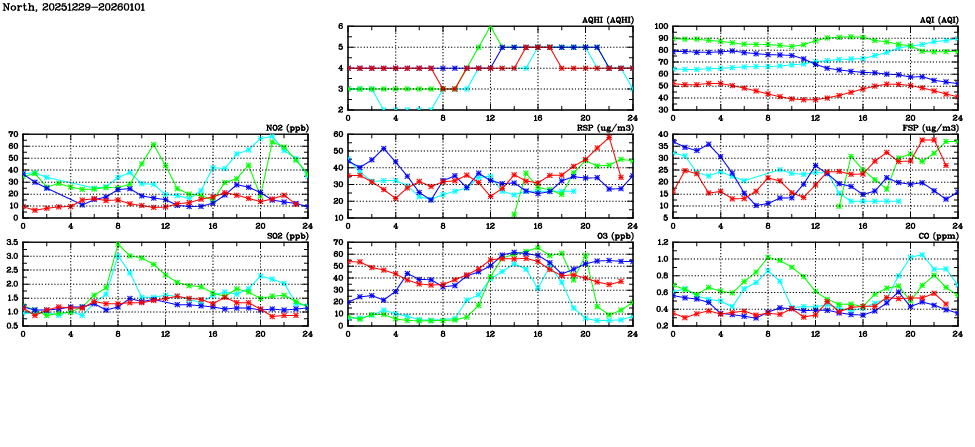 | Air Quality Data Time Series in North (2026/01/01) | ( Line colors: Day -3 Day -2 Day -1 Current day ) | 2D Map Current AQHI |