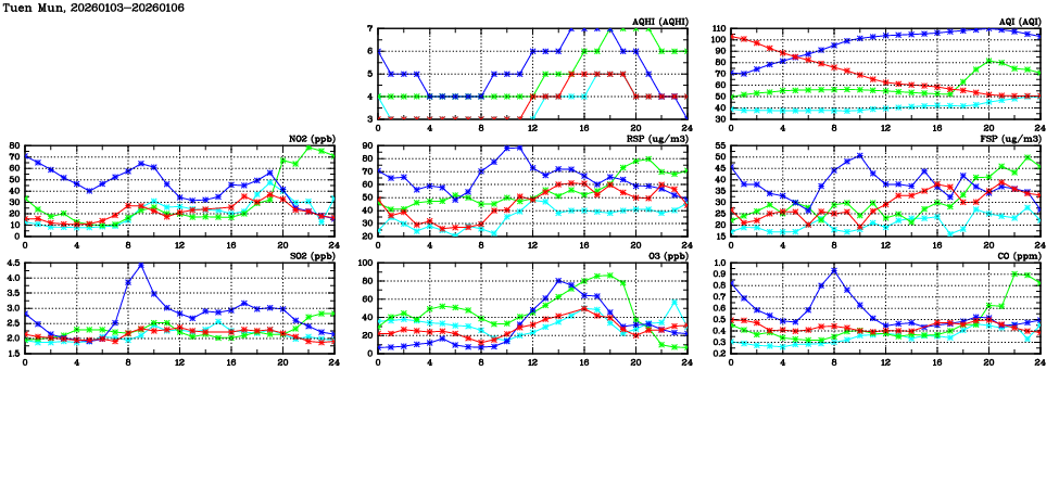| Parameters: | AQHI | AQI | RSP | FSP | NO2 | SO2 | O3 | CO | Temp | WS | WD |