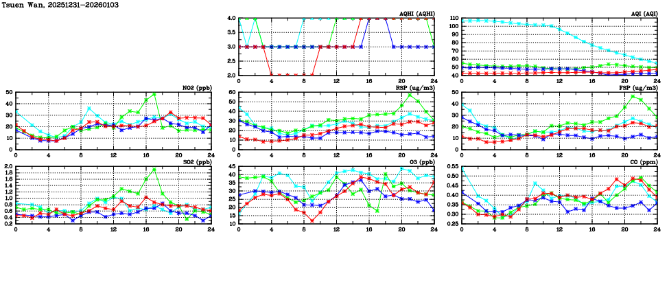 | Air Quality Data Time Series in Tsuen Wan (2026/01/03) | ( Line colors: Day -3 Day -2 Day -1 Current day ) | 2D Map Current AQHI |