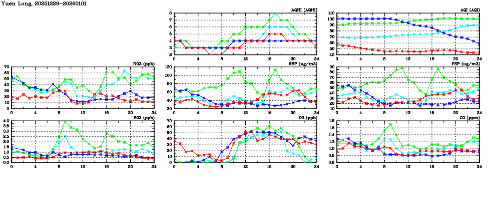 | Air Quality Data Time Series in Yuen Long (2026/01/01) | ( Line colors: Day -3 Day -2 Day -1 Current day ) | 2D Map Current AQHI |