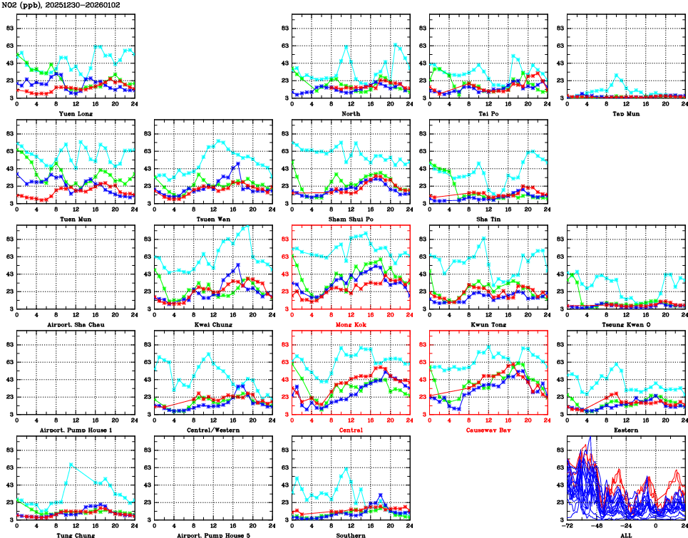 | Air Quality Data Time Series for NO2 (2026/01/02) | ( Line colors: Day -3 Day -2 Day -1 Current day ) | 2D Map Current AQHI |