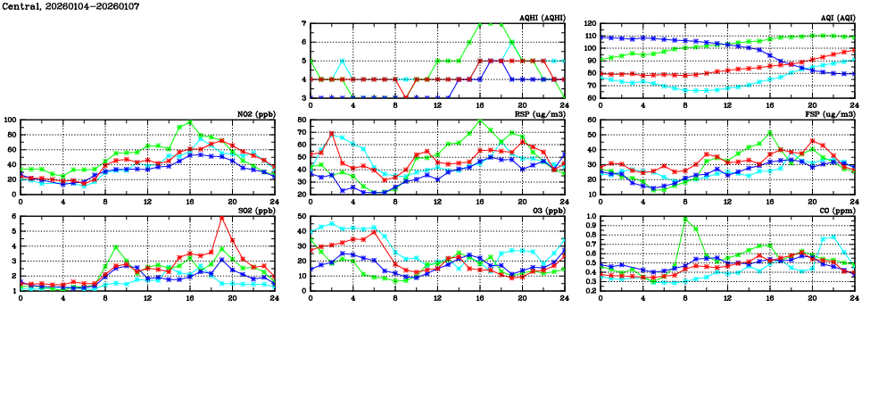 | Air Quality Data Time Series in Central (2026/01/07) | ( Line colors: Day -3 Day -2 Day -1 Current day ) | 2D Map Current AQHI |