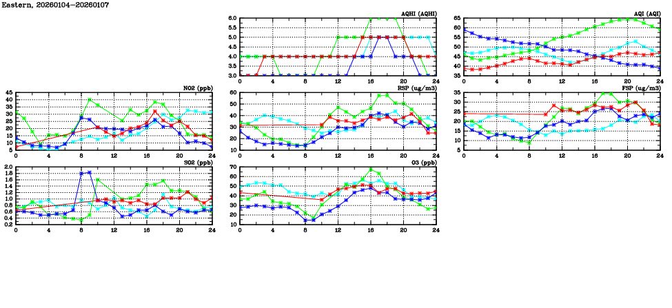| Air Quality Data Time Series in Eastern (2026/01/07) | ( Line colors: Day -3 Day -2 Day -1 Current day ) | 2D Map Current AQHI |
