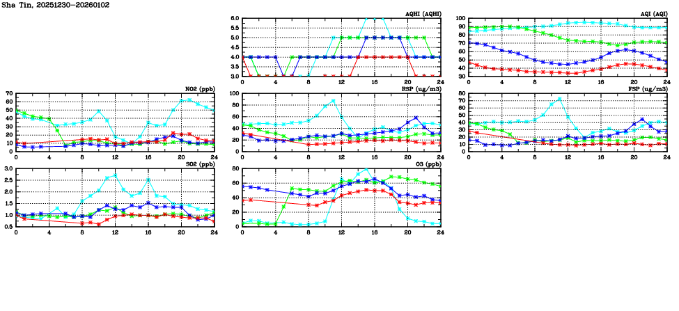 | Air Quality Data Time Series in Sha Tin (2026/01/02) | ( Line colors: Day -3 Day -2 Day -1 Current day ) | 2D Map Current AQHI |