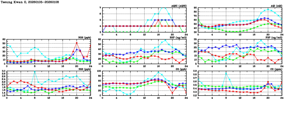 | Air Quality Data Time Series in Tseung Kwan O (2026/01/08) | ( Line colors: Day -3 Day -2 Day -1 Current day ) | 2D Map Current AQHI |