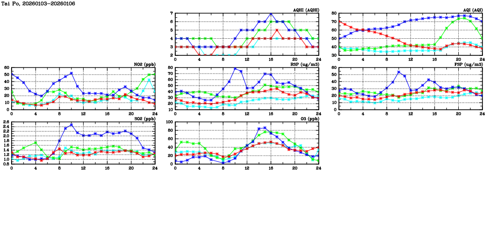 | Air Quality Data Time Series in Tai Po (2026/01/06) | ( Line colors: Day -3 Day -2 Day -1 Current day ) | 2D Map Current AQHI |