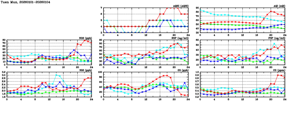 | Air Quality Data Time Series in Tuen Mun (2026/01/04) | ( Line colors: Day -3 Day -2 Day -1 Current day ) | 2D Map Current AQHI |