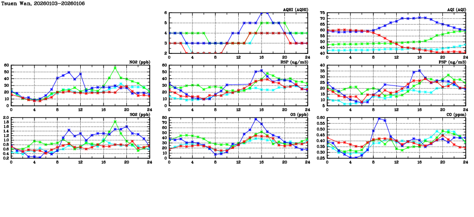 | Air Quality Data Time Series in Tsuen Wan (2026/01/06) | ( Line colors: Day -3 Day -2 Day -1 Current day ) | 2D Map Current AQHI |