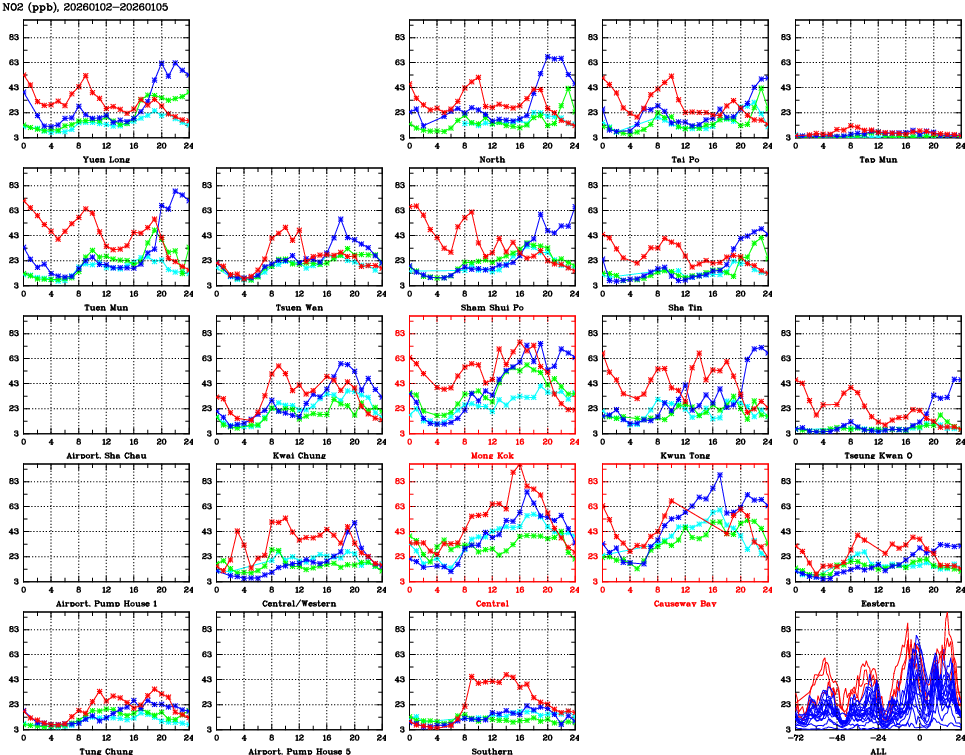 | Air Quality Data Time Series for NO2 (2026/01/05) | ( Line colors: Day -3 Day -2 Day -1 Current day ) | 2D Map Current AQHI |