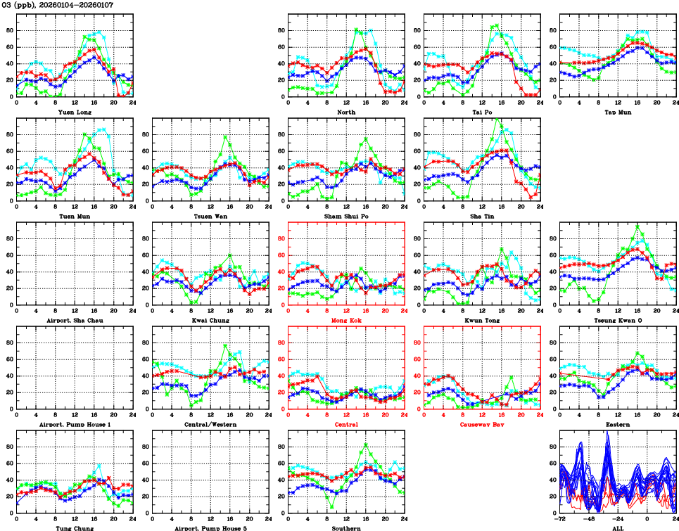 | Air Quality Data Time Series for O3 (2026/01/07) | ( Line colors: Day -3 Day -2 Day -1 Current day ) | 2D Map Current AQHI |
