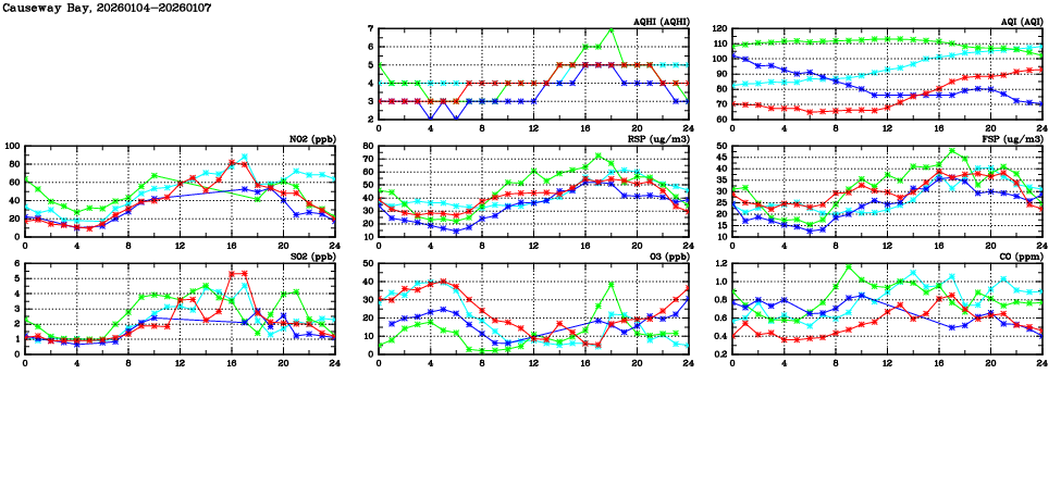 | Air Quality Data Time Series in Causeway Bay (2026/01/07) | ( Line colors: Day -3 Day -2 Day -1 Current day ) | 2D Map Current AQHI |