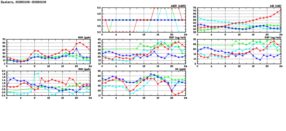 | Air Quality Data Time Series in Eastern (2026/01/09) | ( Line colors: Day -3 Day -2 Day -1 Current day ) | 2D Map Current AQHI |