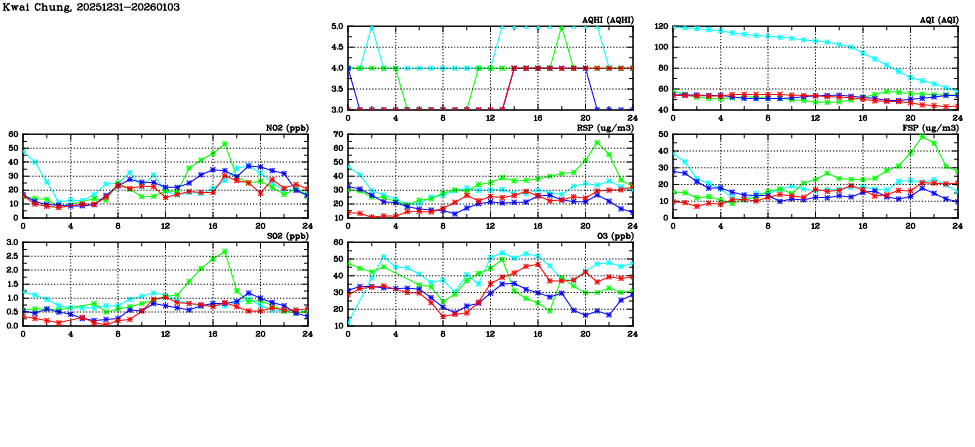 | Air Quality Data Time Series in Kwai Chung (2026/01/03) | ( Line colors: Day -3 Day -2 Day -1 Current day ) | 2D Map Current AQHI |
