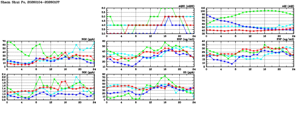 | Air Quality Data Time Series in Sham Shui Po (2026/01/07) | ( Line colors: Day -3 Day -2 Day -1 Current day ) | 2D Map Current AQHI |
