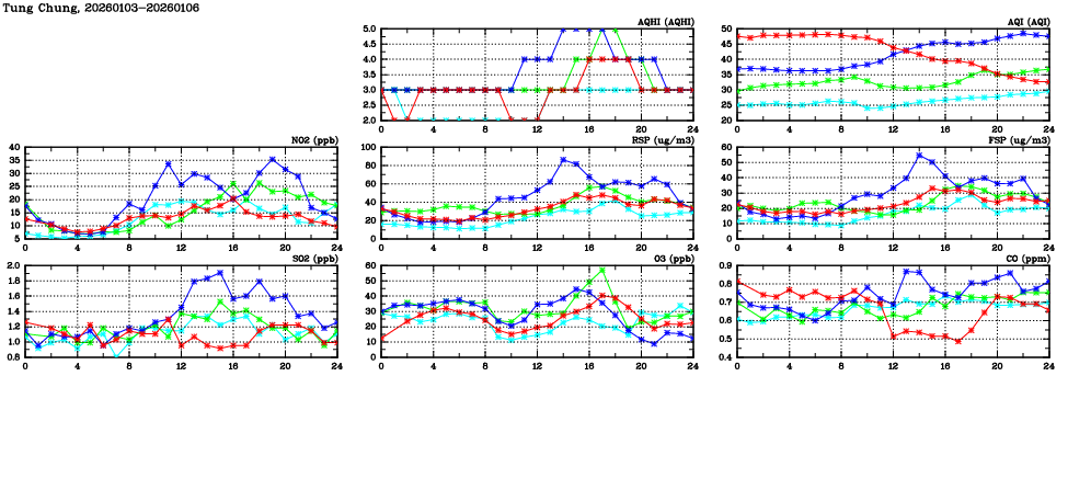 | Air Quality Data Time Series in Tung Chung (2026/01/06) | ( Line colors: Day -3 Day -2 Day -1 Current day ) | 2D Map Current AQHI |