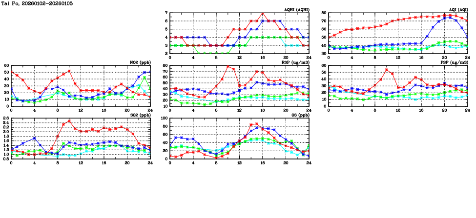 | Air Quality Data Time Series in Tai Po (2026/01/05) | ( Line colors: Day -3 Day -2 Day -1 Current day ) | 2D Map Current AQHI |