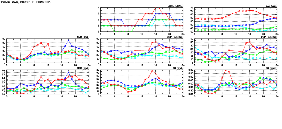 | Air Quality Data Time Series in Tsuen Wan (2026/01/05) | ( Line colors: Day -3 Day -2 Day -1 Current day ) | 2D Map Current AQHI |