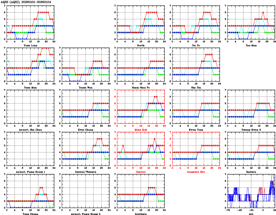 | Air Quality Data Time Series for AQHI (2026/01/04) | ( Line colors: Day -3 Day -2 Day -1 Current day ) | 2D Map Current AQHI |
