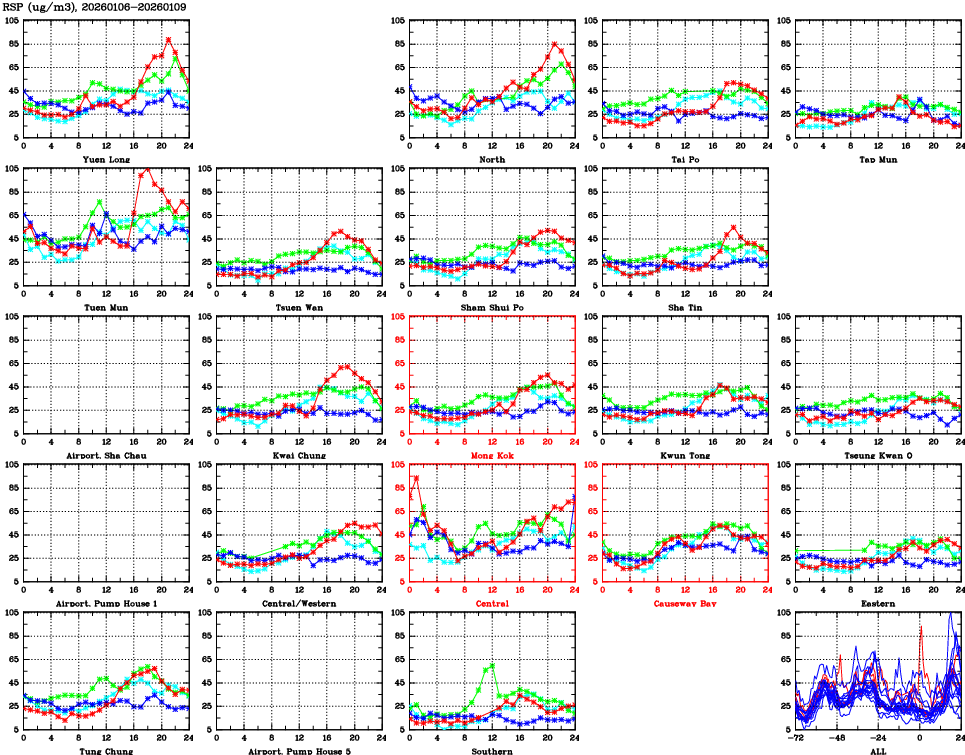 | Air Quality Data Time Series for RSP (2026/01/09) | ( Line colors: Day -3 Day -2 Day -1 Current day ) | 2D Map Current AQHI |