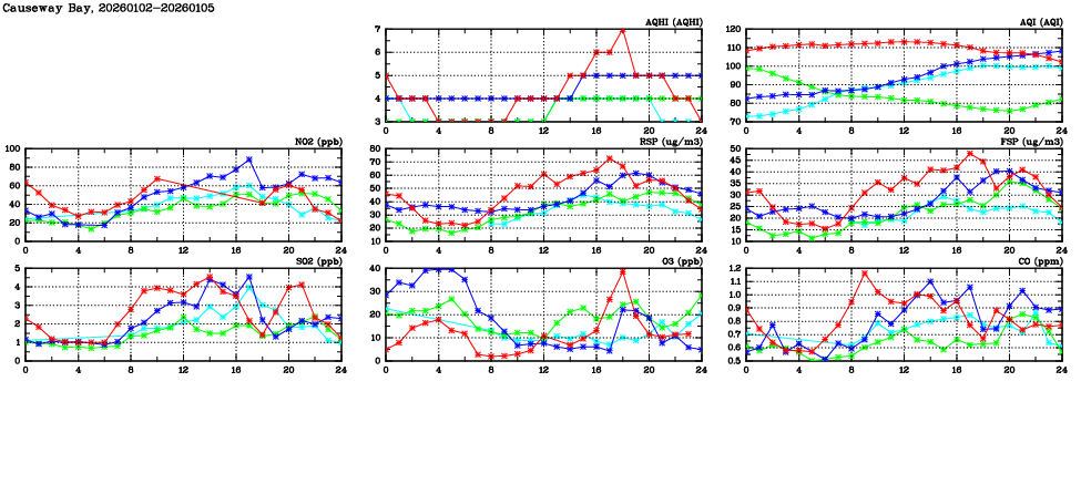 | Air Quality Data Time Series in Causeway Bay (2026/01/05) | ( Line colors: Day -3 Day -2 Day -1 Current day ) | 2D Map Current AQHI |