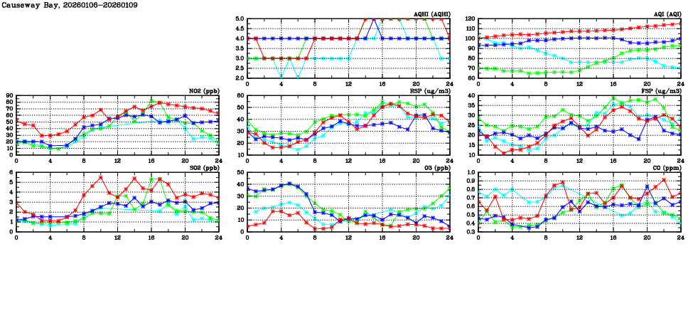 | Air Quality Data Time Series in Causeway Bay (2026/01/09) | ( Line colors: Day -3 Day -2 Day -1 Current day ) | 2D Map Current AQHI |