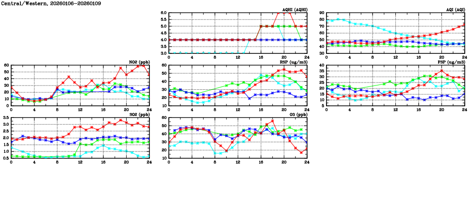 | Air Quality Data Time Series in Central/Western (2026/01/09) | ( Line colors: Day -3 Day -2 Day -1 Current day ) | 2D Map Current AQHI |