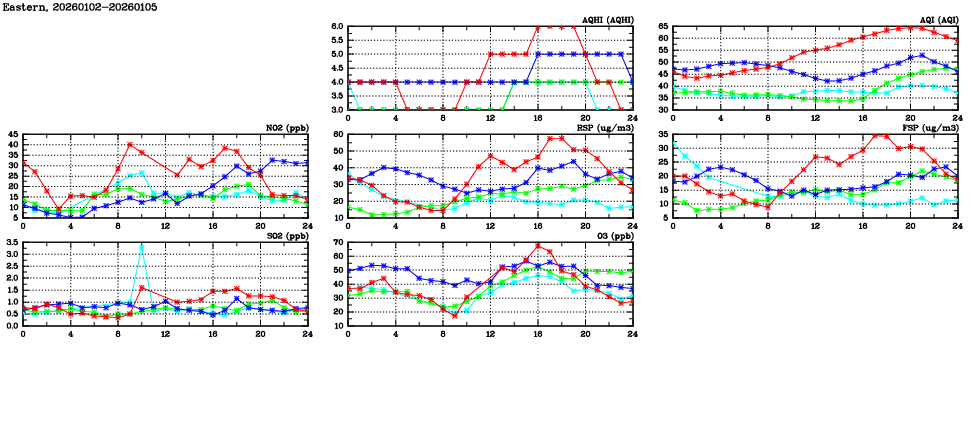 | Air Quality Data Time Series in Eastern (2026/01/05) | ( Line colors: Day -3 Day -2 Day -1 Current day ) | 2D Map Current AQHI |