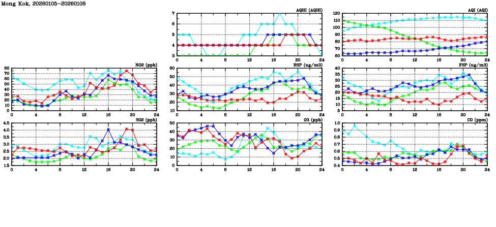 | Air Quality Data Time Series in Mong Kok (2026/01/08) | ( Line colors: Day -3 Day -2 Day -1 Current day ) | 2D Map Current AQHI |