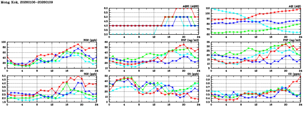 | Air Quality Data Time Series in Mong Kok (2026/01/09) | ( Line colors: Day -3 Day -2 Day -1 Current day ) | 2D Map Current AQHI |