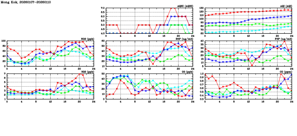 | Air Quality Data Time Series in Mong Kok (2026/01/10) | ( Line colors: Day -3 Day -2 Day -1 Current day ) | 2D Map Current AQHI |
