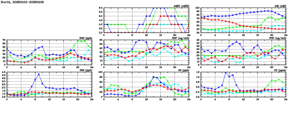 | Air Quality Data Time Series in North (2026/01/06) | ( Line colors: Day -3 Day -2 Day -1 Current day ) | 2D Map Current AQHI |