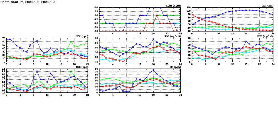 | Air Quality Data Time Series in Sham Shui Po (2026/01/06) | ( Line colors: Day -3 Day -2 Day -1 Current day ) | 2D Map Current AQHI |