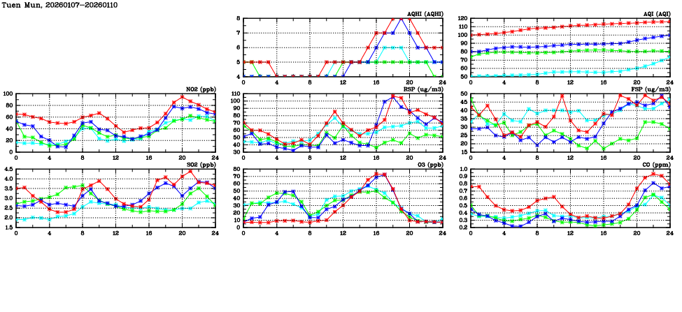 | Parameters: | AQHI | AQI | RSP | FSP | NO2 | SO2 | O3 | CO | Temp | WS | WD |