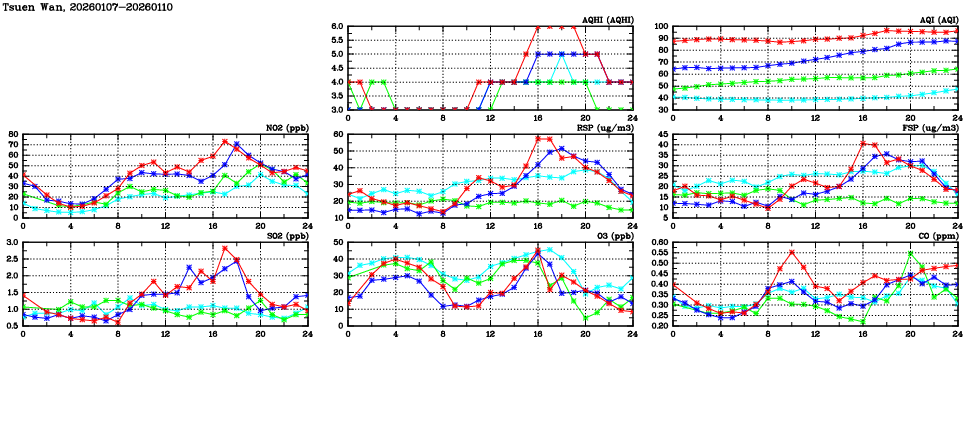 | Air Quality Data Time Series in Tsuen Wan (2026/01/10) | ( Line colors: Day -3 Day -2 Day -1 Current day ) | 2D Map Current AQHI |