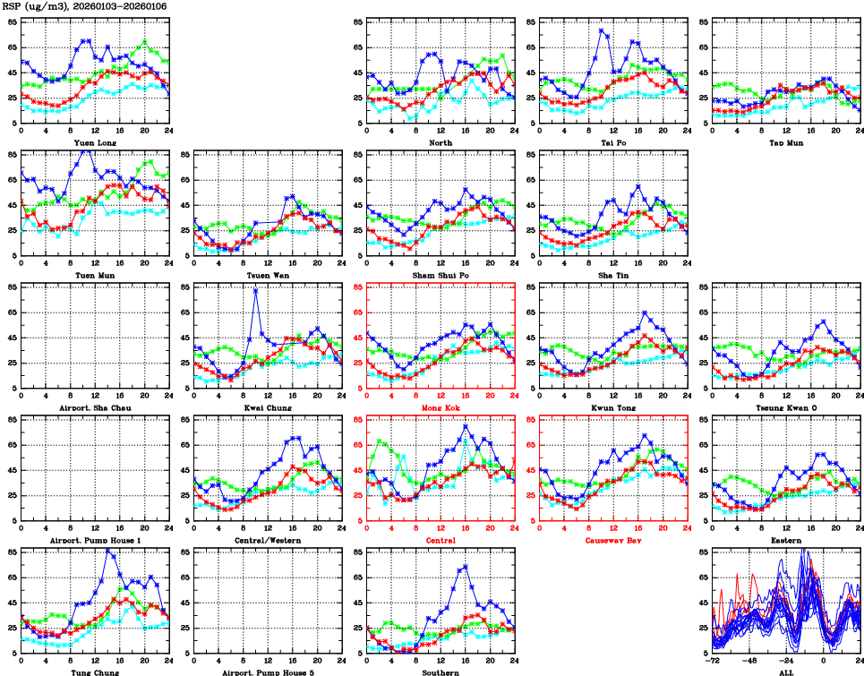 | Air Quality Data Time Series for RSP (2026/01/06) | ( Line colors: Day -3 Day -2 Day -1 Current day ) | 2D Map Current AQHI |