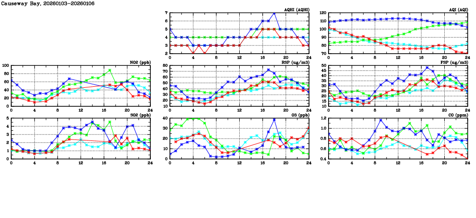 | Air Quality Data Time Series in Causeway Bay (2026/01/06) | ( Line colors: Day -3 Day -2 Day -1 Current day ) | 2D Map Current AQHI |