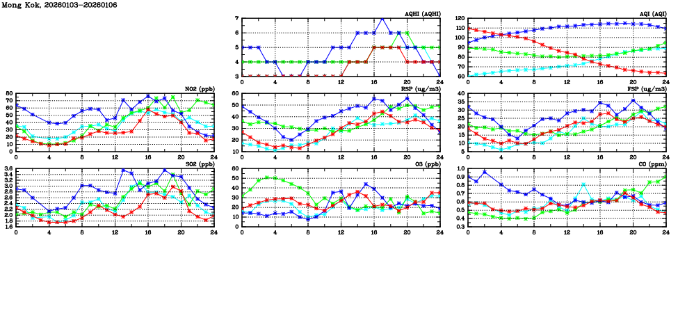| Air Quality Data Time Series in Mong Kok (2026/01/06) | ( Line colors: Day -3 Day -2 Day -1 Current day ) | 2D Map Current AQHI |