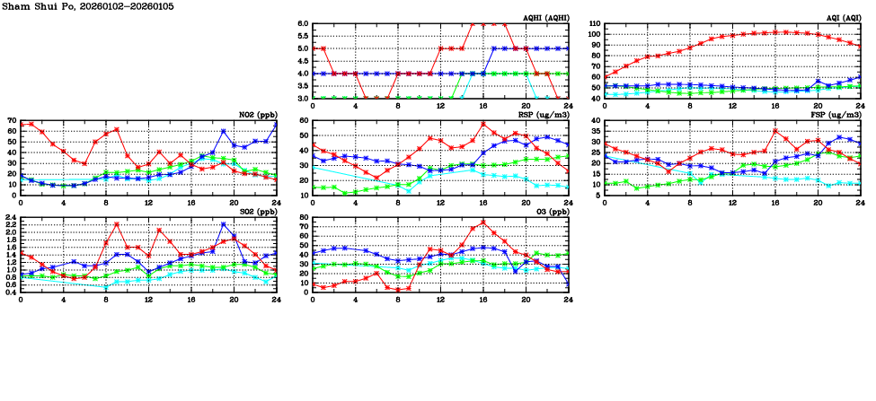 | Air Quality Data Time Series in Sham Shui Po (2026/01/05) | ( Line colors: Day -3 Day -2 Day -1 Current day ) | 2D Map Current AQHI |