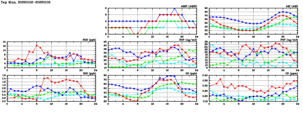 | Air Quality Data Time Series in Tap Mun (2026/01/05) | ( Line colors: Day -3 Day -2 Day -1 Current day ) | 2D Map Current AQHI |