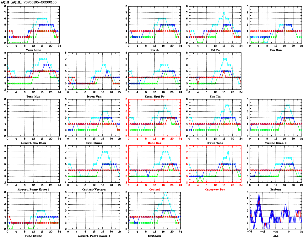 | Air Quality Data Time Series for AQHI (2026/01/08) | ( Line colors: Day -3 Day -2 Day -1 Current day ) | 2D Map Current AQHI |