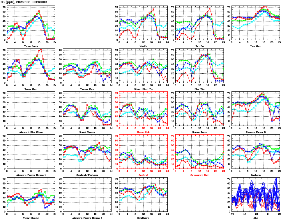 | Air Quality Data Time Series for O3 (2026/01/09) | ( Line colors: Day -3 Day -2 Day -1 Current day ) | 2D Map Current AQHI |