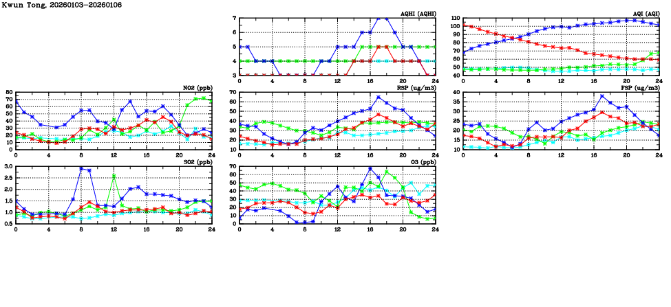 | Air Quality Data Time Series in Kwun Tong (2026/01/06) | ( Line colors: Day -3 Day -2 Day -1 Current day ) | 2D Map Current AQHI |
