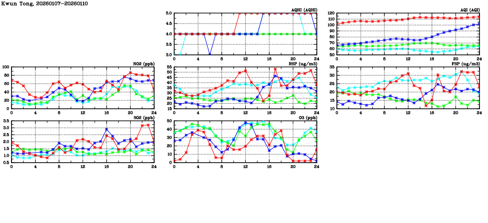 | Air Quality Data Time Series in Kwun Tong (2026/01/10) | ( Line colors: Day -3 Day -2 Day -1 Current day ) | 2D Map Current AQHI |