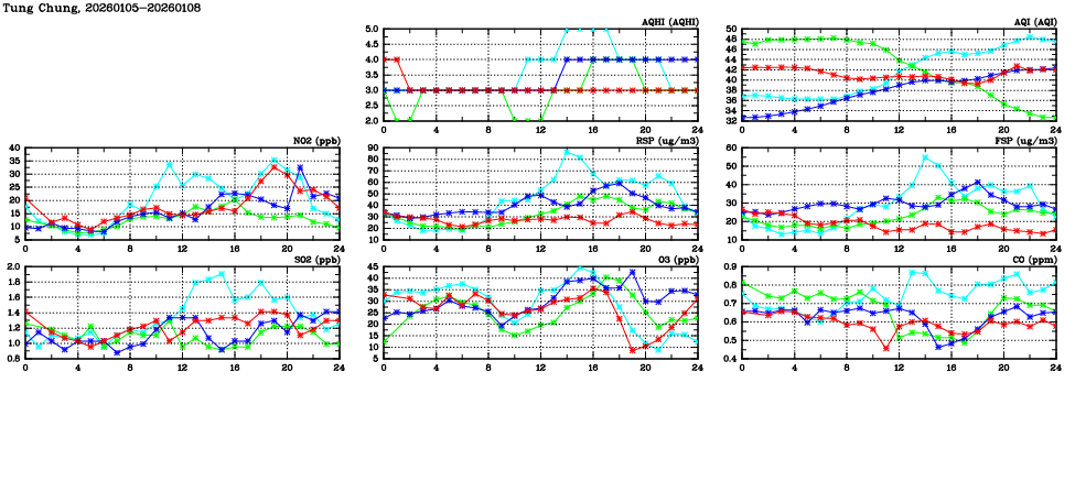 | Air Quality Data Time Series in Tung Chung (2026/01/08) | ( Line colors: Day -3 Day -2 Day -1 Current day ) | 2D Map Current AQHI |