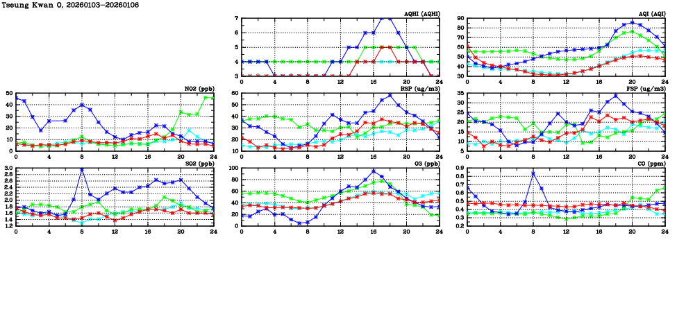 | Air Quality Data Time Series in Tseung Kwan O (2026/01/06) | ( Line colors: Day -3 Day -2 Day -1 Current day ) | 2D Map Current AQHI |
