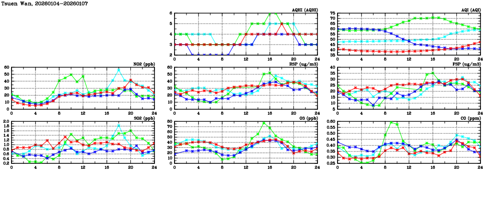 | Air Quality Data Time Series in Tsuen Wan (2026/01/07) | ( Line colors: Day -3 Day -2 Day -1 Current day ) | 2D Map Current AQHI |
