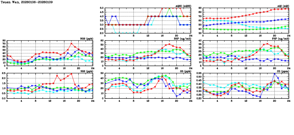 | Air Quality Data Time Series in Tsuen Wan (2026/01/09) | ( Line colors: Day -3 Day -2 Day -1 Current day ) | 2D Map Current AQHI |