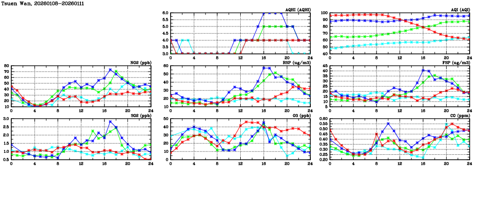 | Air Quality Data Time Series in Tsuen Wan (2026/01/11) | ( Line colors: Day -3 Day -2 Day -1 Current day ) | 2D Map Current AQHI |