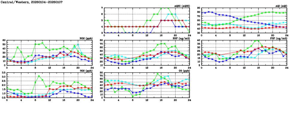 | Air Quality Data Time Series in Central/Western (2026/01/07) | ( Line colors: Day -3 Day -2 Day -1 Current day ) | 2D Map Current AQHI |