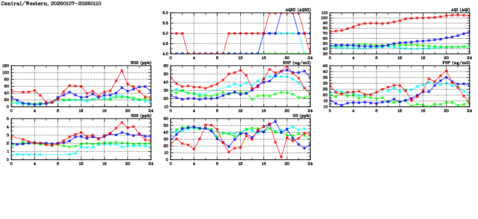| Air Quality Data Time Series in Central/Western (2026/01/10) | ( Line colors: Day -3 Day -2 Day -1 Current day ) | 2D Map Current AQHI |